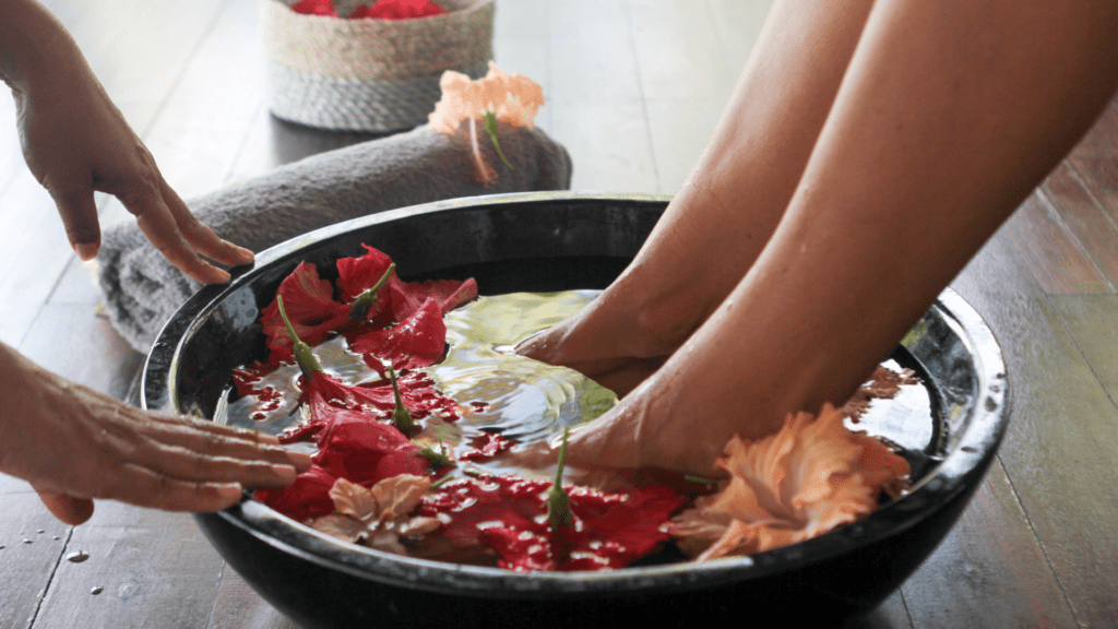 Massagem em pontos energéticos com higienização, esfoliação, hidratação e imersão dos pés em água morna durante alguns minutos. Tem a finalidade de aliviar as dores e promover sensação de relaxamento, equilíbrio físico mental e energético.
